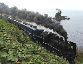 C57-180はJR西の山口線山口号の人気に対抗して復活させた機関車で主に磐越西線の「ばんえつ物語号」で活躍している。 |
