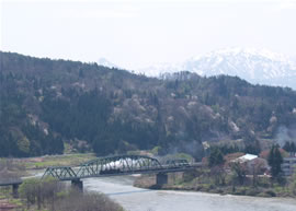 今やJR東日本の定期SL列車としては知名度も高い「SLばんえつ号」は撮影も今回で5度目になる。 たまにはロングショットで盤越路のすばらしい風景も見てもらいたい! (H18.5.3 JR盤越西線鹿瀬付近) |